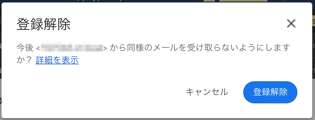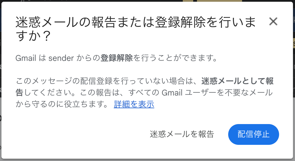 これでメールを送信し、Gmail側で購読停止すると、迷惑メールに入れる確認ダイアログが出ます。